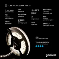 Светодиодная лента 2м 12В 20Вт/м 4000К IP33 нейтральная дневная подсветка 240 Вт/м Geni